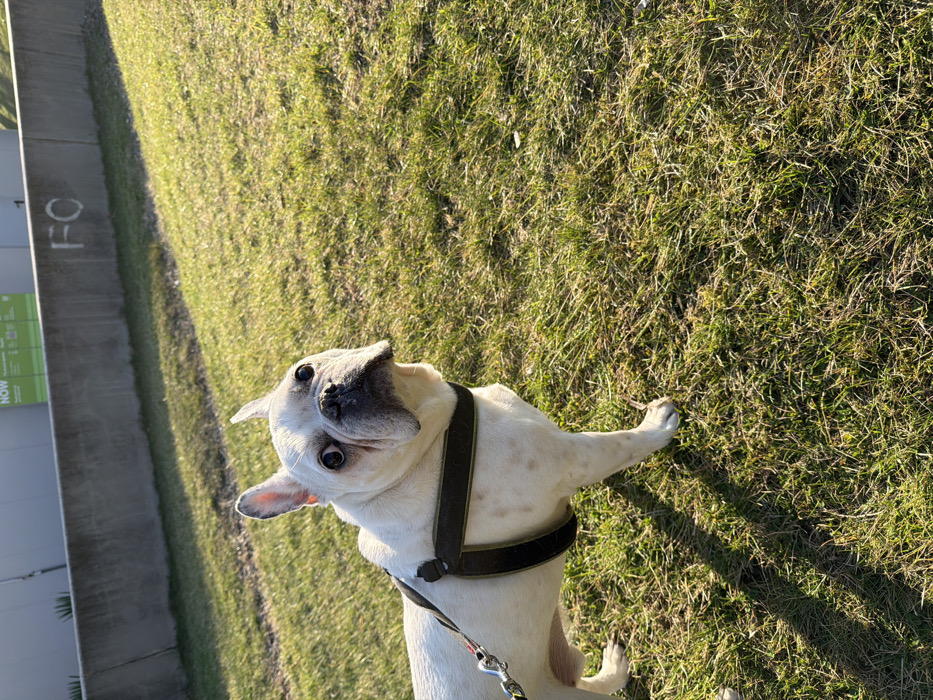 - "A white-coated French Bulldog, exhibiting light brown speckling on its lower limbs, stands on a grassy slope under direct sunlight" by FM-DK2ln2, licensed under CC BY 4.0