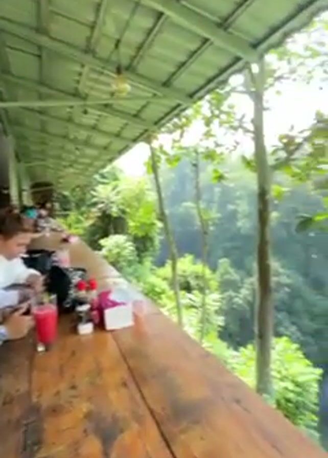 three women sitting at a long wooden table on a covered porch, with a view of a waterfall in a lush green forest. The women are smiling and appear to be enjoying the scenery. The camera pans from the women to the waterfall, showing the water cascading down a rocky cliff face surrounded by trees. There are drinks and other items on the table in front of the women.