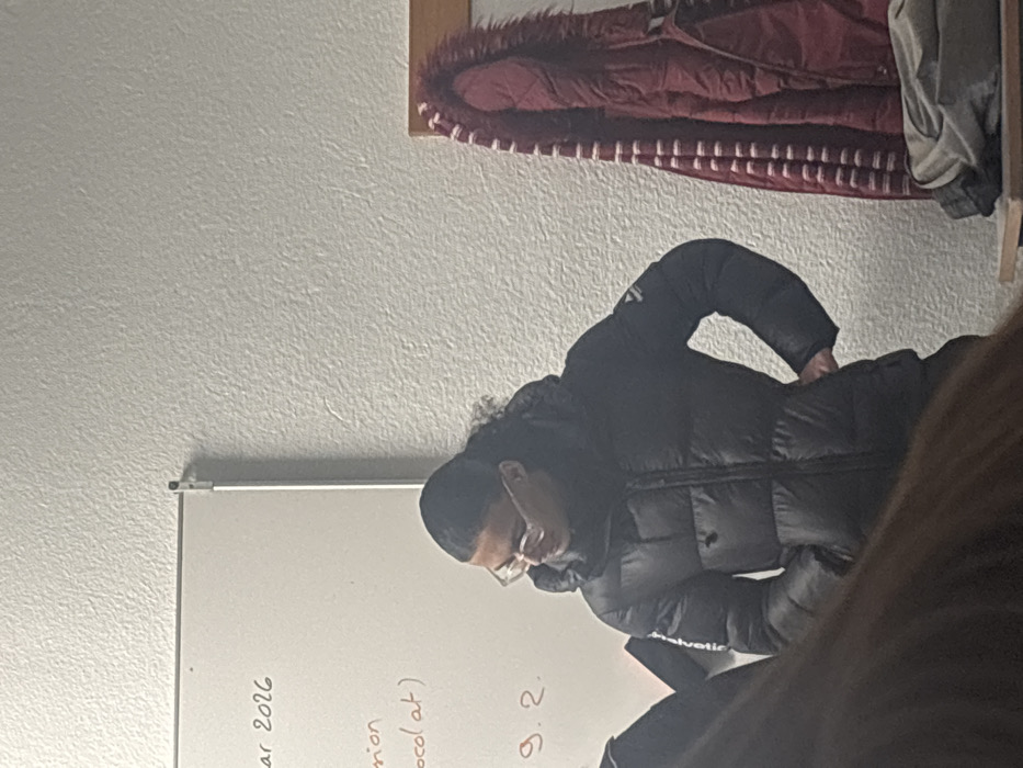 The scene depicts an interior room in Strasbourg, France, characterized by a white, textured wall. On the left, a portion of a whiteboard is visible, displaying handwritten text including "ar 2026", "rion", "ocol at)", and "9. 2.". A male individual stands in the midground, facing slightly left with his head tilted downwards. He wears a black puffer jacket over a black turtleneck and clear-framed eyeglasses. His dark, wavy hair is pulled back. His left hand is placed inside his jacket pocket, while his right hand rests on his hip. To the right of the individual, a maroon-colored quilted jacket with a fur-lined hood hangs on a wooden rack or hanger. Below the hanging jacket, a light-colored fabric item is folded on a surface. A blurred, dark-haired head or shoulder is present in the extreme foreground, indicating the perspective of the camera.