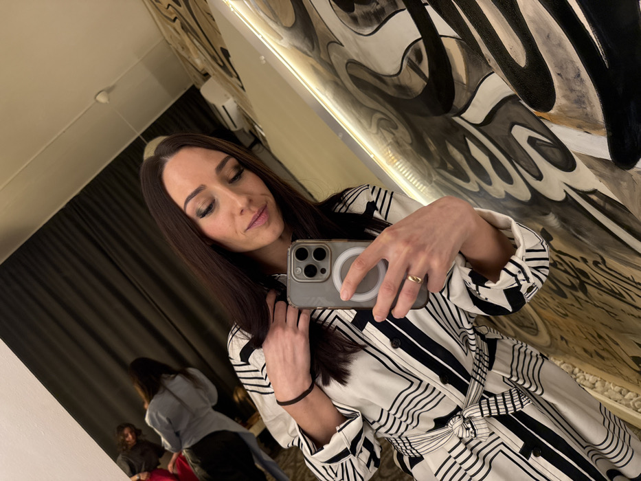 A female subject is depicted in a mirror selfie taken indoors in Saint Petersburg, Russia. She has long, straight dark brown hair and is wearing a long-sleeved, collared dress or robe with a geometric black and white pattern, secured at the waist with a matching fabric belt. A black elastic band is present on her left wrist, and a plain gold-toned ring is worn on her right ring finger. She holds a light gray smartphone, equipped with a MagSafe ring, in her right hand, directing her gaze towards the screen. Her left hand is positioned near her chest, seemingly adjusting her hair or collar. The mirror's reflection reveals a background with dark, vertically pleated curtains. To the subject's left, a decorative wall panel with abstract black, white, and gray organic patterns is visible, along with a linear light fixture and an air conditioning unit. To her right, a plain white wall corner is present. Further in the background reflection, two additional individuals are partially seen: one largely obscured, appearing to wear dark clothing with red elements, and another from the back, dressed in a light blue top and dark lower garments. The bottom edge of the reflected scene indicates a textured floor, possibly composed of small pebbles or stones.