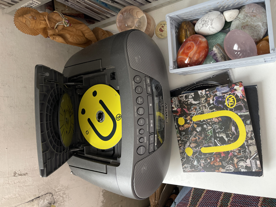 The scene is set on a white surface, likely a table or shelf, against a light-colored, cracked, and discolored wall in Khimki, Russia. A dark grey Sony boombox, model ZS-M90P "Personal Audio System," occupies the central foreground. Its top-loading CD compartment is open, revealing a bright yellow compact disc bearing a black stylized "U" logo and a "TM" symbol. The boombox features a series of grey control buttons for functions including "OPERATE," "DISPLAY," "MODE," "CD," "RADIO," "AUDIO IN," "VOLUME," and "PRESET," with perforated speaker grilles on its front. To the immediate left of the boombox, a CD album titled "MADLIB - SOUND ANCIENT" rests on another CD case. The album cover prominently displays a large yellow "U" logo over a black and white photographic collage depicting various individuals. To the right of the boombox, a light grey rectangular plastic basket holds a collection of polished, variously colored stones and crystals, including hues of red, orange, brown, white, purple, pink, and green. Adjacent to the boombox on this side are a translucent, possibly glass, orb or paperweight and a small, flat, round decorative item. In the background, a light brown wooden carving of a figure, possibly Krishna playing a flute, stands upright. The figure is adorned with a necklace featuring a prominent red gem. Partially visible behind the carving is a shelf or rack containing multiple vertically stacked compact disc cases.