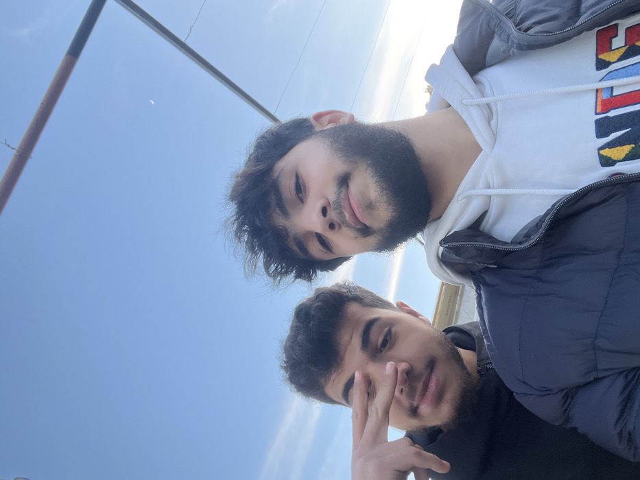Two young men pose closely for a selfie under a bright, clear sky. The person in the foreground makes a hand gesture, while the other is slightly behind, wearing a white hooded sweatshirt under a dark blue puffer jacket. A metal bar with some wires stretches diagonally across the upper left corner of the frame. The overall image composition tilts slightly.