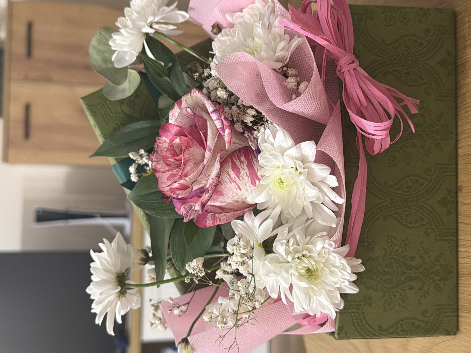 The image displays a floral arrangement in an indoor residential setting, specifically a living room, in the city of Unknown, Unknown. The arrangement rests on a light brown wooden surface. The central object is a rectangular, olive green box featuring an embossed, ornate pattern. Inside the box, a bouquet of flowers is arranged, wrapped in pink textured material and green foliage. The bouquet contains one prominent variegated rose, exhibiting distinct pink and white striations. Several white chrysanthemum-type flowers with numerous petals and light green-yellow centers are present, along with smaller clusters of white Baby's Breath. Various green leaves, including rounded and smaller dark green varieties, are integrated into the arrangement. A bright pink raffia-style ribbon is tied into a bow on the right side of the box. The background reveals a partially visible dark grey flat-screen television on the left. Centrally positioned is a white, vertically oriented PlayStation 5 console. To the right, a light brown wooden cabinet with two dark horizontal handles is discernible. No individuals, actions, or direct interactions are depicted. The scene is illuminated by ambient interior light.