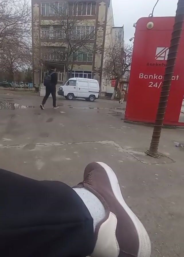 A person is sitting with their legs crossed, wearing black pants, a white sock, and a brown slip-on shoe with a white sole. The camera is focused on the person's shoe. In the background, there is a four-story building, a white van, and a red Bankomat kiosk with white lettering. A person is walking across the street. The sky is overcast. The ground appears wet.