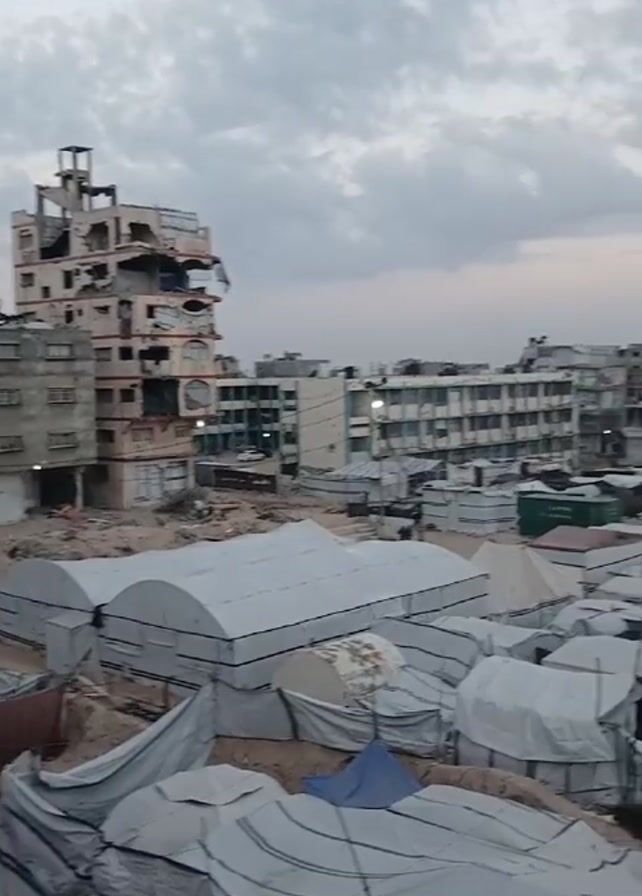 The video displays a cityscape under an overcast sky. In the foreground, a large cluster of white and grey tents dominates the view, suggesting a refugee or displacement camp. Some tents appear worn, with torn or loosely draped fabric. In the background, beyond the tent encampment, are damaged buildings, including a partially destroyed multi-story building with a jagged silhouette. A taller, intact building stands nearby, appearing to be a school or hospital, with rows of windows and a light-colored exterior. A few other buildings are visible further back, though their condition and purpose are difficult to discern. The overall impression is one of devastation and displacement, with the tents highlighting the scale of the humanitarian crisis.