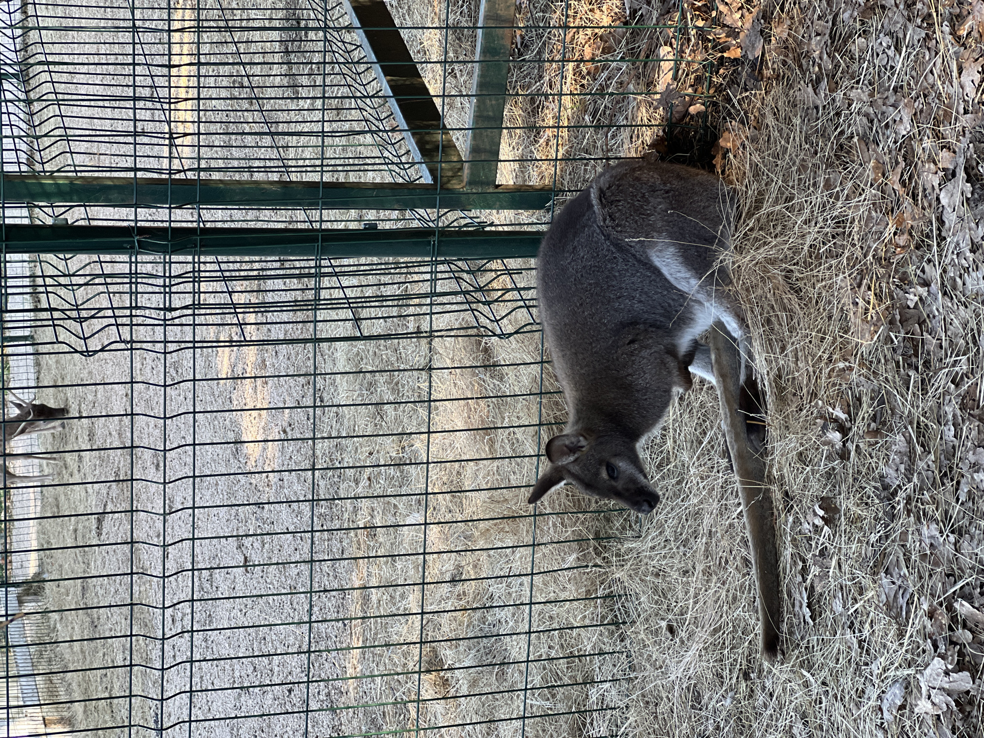 A kangaroo stands near a green wire fence in an enclosure partially covered with dry straw and leaves. Another kangaroo is partially visible in the bottom left corner of the image, inside the fence. The scene is outdoors in daylight.