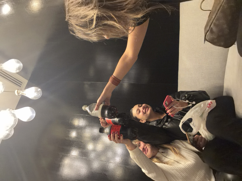 Three women are visible in the image. One leans down holding a clear and two red coca-cola bottles. The two other women lounge on a couch, one wearing a white sweater and the other a black jacket, holding a pink phone. A white plastic bag is near the women on the couch. A light fixture with multiple bulbs illuminates the left side. The background features a dark wall and a tan bag on the couch.