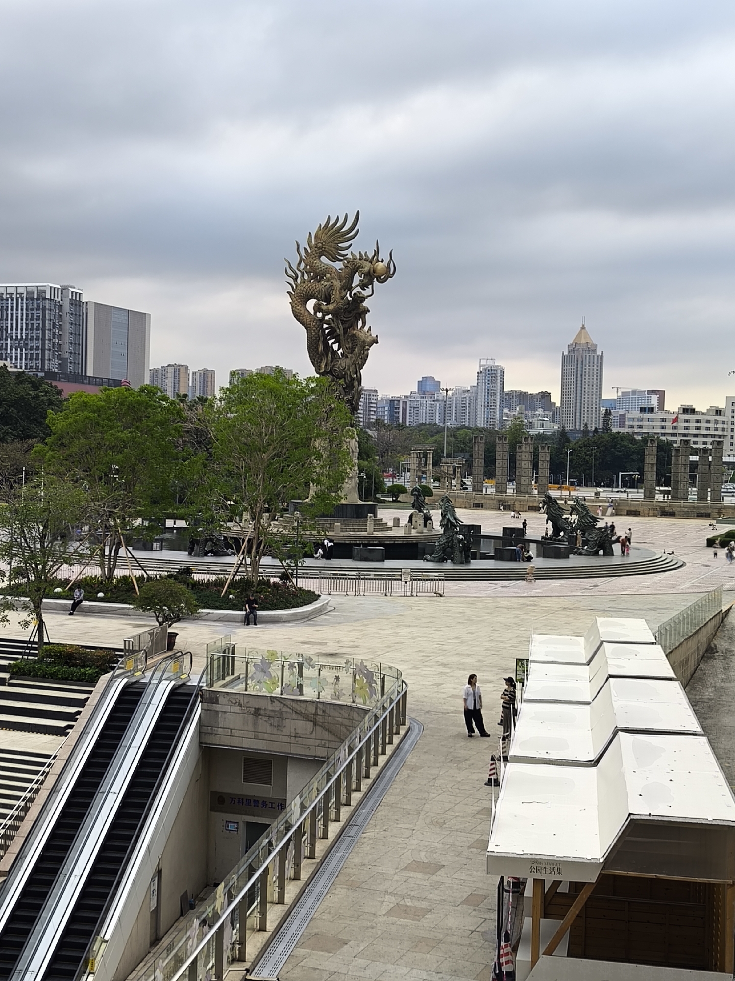 public square in Longgang District, China. In the background, a skyline of modern buildings is visible under a cloudy sky. The focal point of the square is a large bronze statue of a dragon. In the foreground, there is an escalator leading down to a lower level and a row of small, covered booths. People are walking around the square, and some are gathered near the statue. The ground is paved with light-colored stone tiles. There are trees and landscaped areas around the square. A building houses a police station marked as "Wan Li Police Workstation (万里警务工作)."