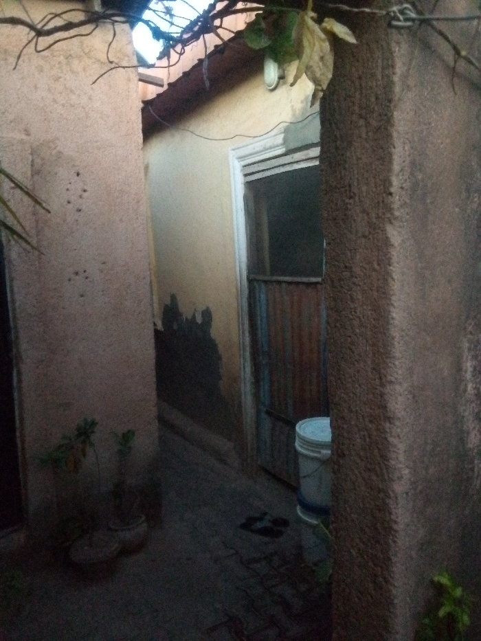 This image depicts a narrow outdoor passage between two structures in Bukuru, Nigeria