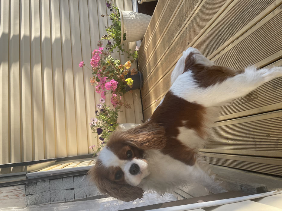 - "A Cavalier King Charles Spaniel, predominantly white with large brown patches on its body and face (Blenheim coloration), is depicted standing on a light-colored wooden slatted deck" by FM-k41Xm2, licensed under CC BY 4.0