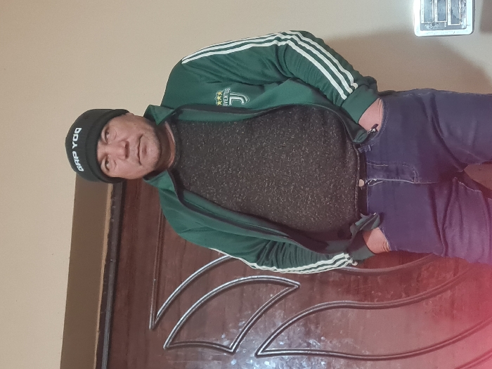 A middle-aged man wears a black beanie with white lettering, a green jacket with white stripes, a dark gray shirt, and blue jeans