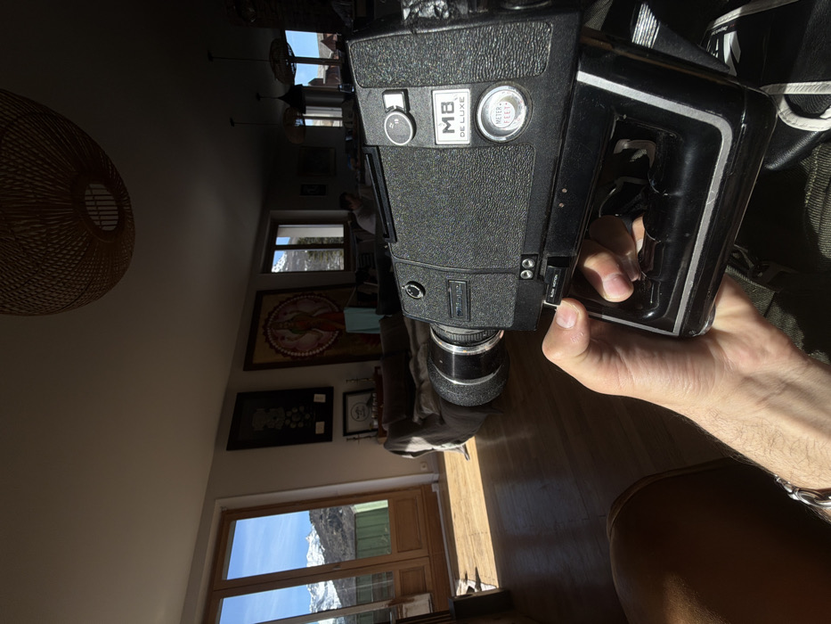 - "The image captures an indoor residential scene in Briançon, France, featuring a hand holding a vintage film camera with a bright mountainous backdrop visible through windows" by FM-i85E53, licensed under CC BY 4.0