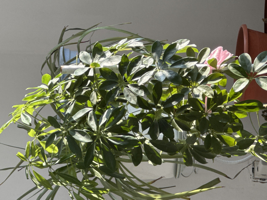 The image depicts a close-up view of indoor or sheltered outdoor foliage, presumed to be located in село имени 9 Января, Russia. A large, healthy Schefflera (umbrella tree) plant, characterized by its dark green, glossy, palmate compound leaves, dominates the central and foreground. Direct sunlight from the upper left illuminates much of the plant, creating bright highlights on the leaves and casting varied shadows. The Schefflera is contained within a white pot, partially visible towards the lower left. A white vertical support pole is discernible amidst the dense foliage. To the upper left and behind the primary plant, a second plant with long, thin, drooping green leaves is visible, housed in a light blue hanging pot. A terracotta-colored pot, appearing empty, is positioned in the lower right corner of the frame. A pink, possibly artificial flower or decorative element, is partially visible nestled within the lower-right foliage of the Schefflera. The background consists of a plain, light-colored wall or surface. No human subjects or discernible interactions are present.