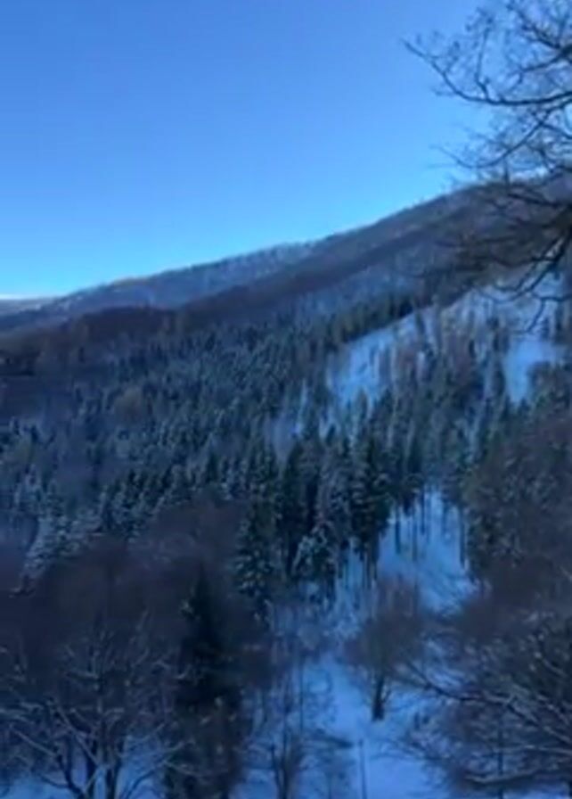 The video pans across a winter mountain landscape, showcasing trees laden with snow against a clear blue sky