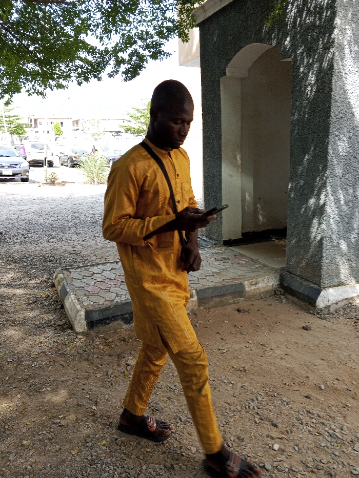 An outdoor scene in Lokoja, Nigeria, depicts an adult male walking leftward in profile, his left foot raised mid-stride