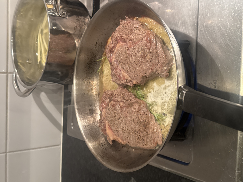- "An indoor kitchen scene in Eindhoven, Netherlands, depicts two portions of seasoned meat, likely ribeye steaks, searing in a stainless steel frying pan" by FM-6wyrF3, licensed under CC BY 4.0