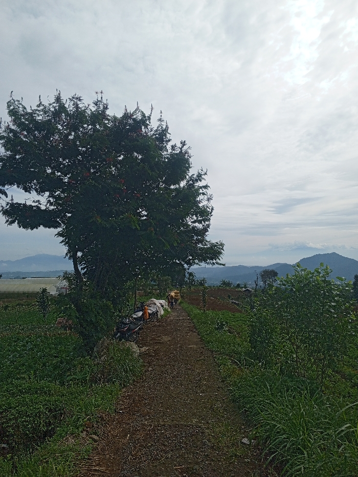 A dirt path stretches into the distance, flanked by lush greenery and cultivated fields. A large tree with hints of red stands on the left, casting shade on parked bicycles. Two figures walk along the path, carrying what appear to be heavy loads. In the background, rolling hills and mountains are visible under a cloudy, overcast sky. A greenhouse-like structure peeks out on the left horizon.