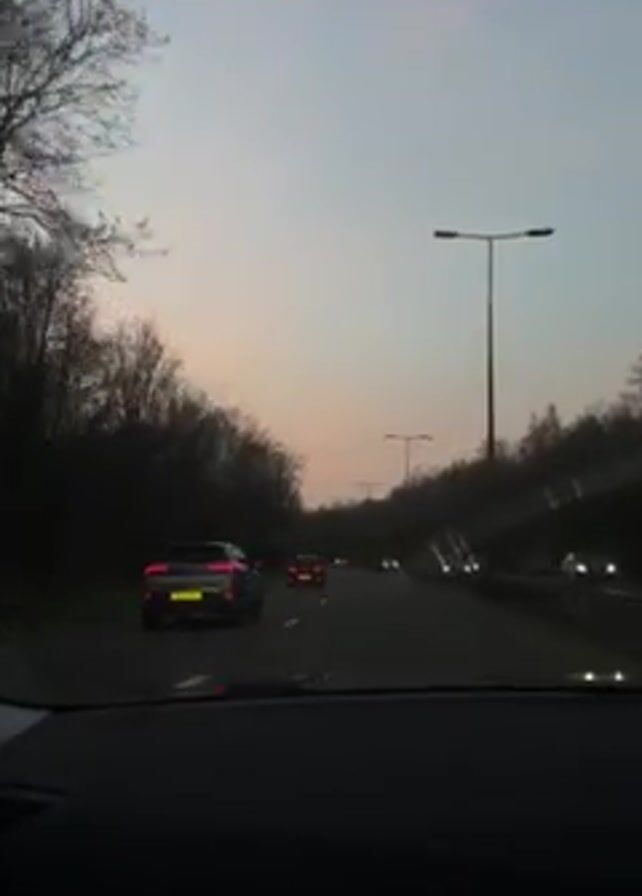 view from inside a car, looking out through the windshield, while driving on a highway. The sky is dusky with a hint of orange on the horizon. The road has multiple lanes, with other cars traveling in the same direction. Trees line both sides of the road. Streetlights are visible at intervals. The camera car overtakes a grey car. The video remains steady throughout.