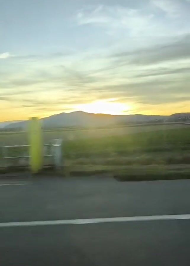 view from a moving vehicle on a highway, facing a flat, green field, with a mountain range on the horizon. The sun is setting behind the mountains, casting a golden glow. The sky is partly cloudy, with blue and gray tones. A metal guardrail is visible along the roadside.