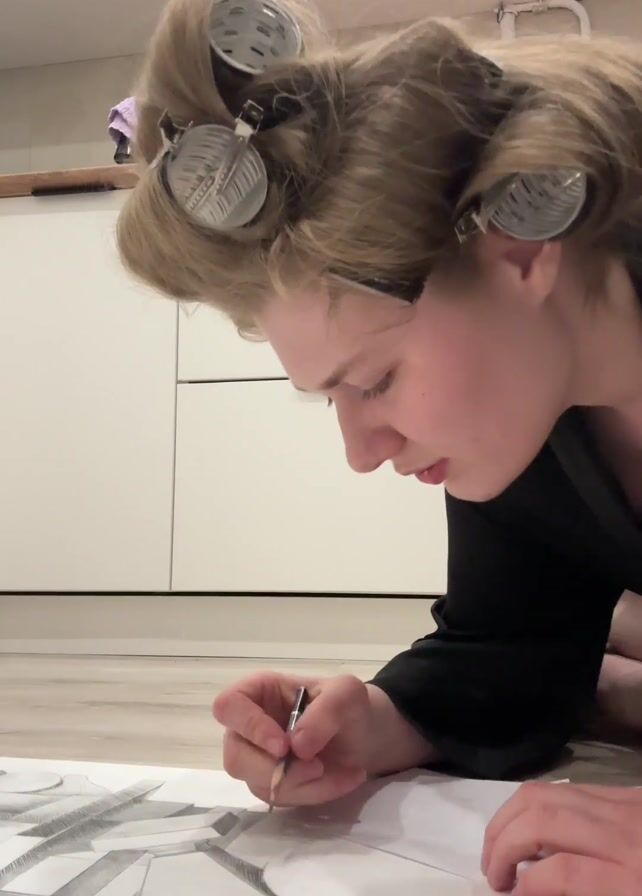 A woman with blond hair and four hair rollers is kneeling on a light wooden floor, drawing on a large piece of white paper with a pencil. She is wearing a black robe and is focused on her work. The drawing appears to be an abstract geometric design. In the background, there is a white kitchen cabinet with a light-colored wooden countertop. There is a purple cloth on the countertop. The woman's face is visible in profile. She seems to be concentrating on the details of her drawing.