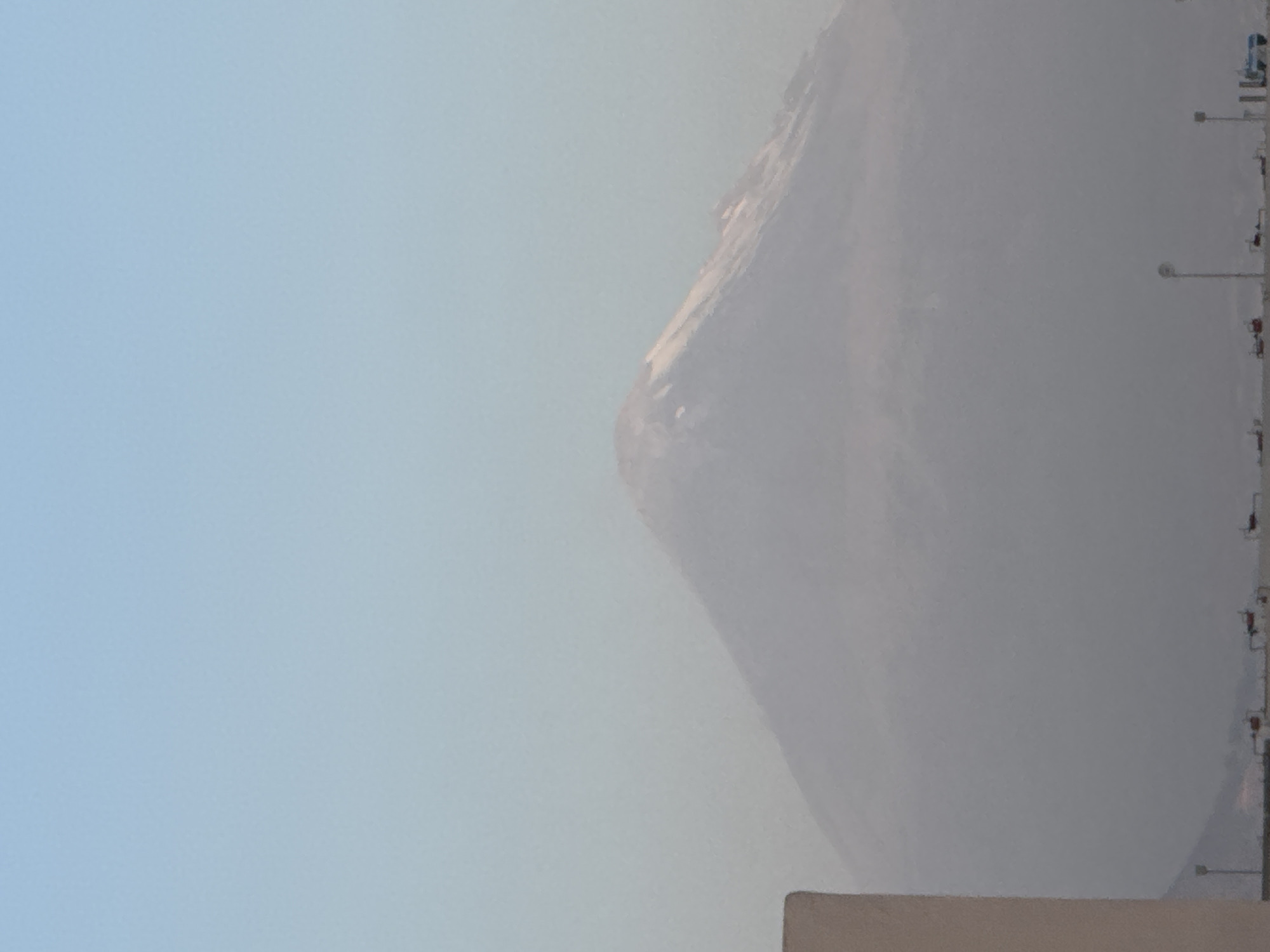 The image displays a distant, hazy view of a prominent, snow-capped mountain, consistent with a stratovolcano like Popocatépetl or Iztaccihuatl, visible from San Francisco Ocotlán, Mexico. The mountain occupies the central and background planes, with its upper slopes and peak exhibiting white snow or ice formations against a pale blue sky. The lower half of the mountain and the distant landscape are significantly obscured by atmospheric haze. A partial view of a light-colored, vertical architectural structure is present in the lower-left foreground. Below the mountain's base, a faint horizon line reveals a sparse array of vertical poles resembling streetlights and small, indistinct structures, some with red highlights, typical of a distant urban or industrial setting. No individuals, specific actions, or interactions are visible within the scene.