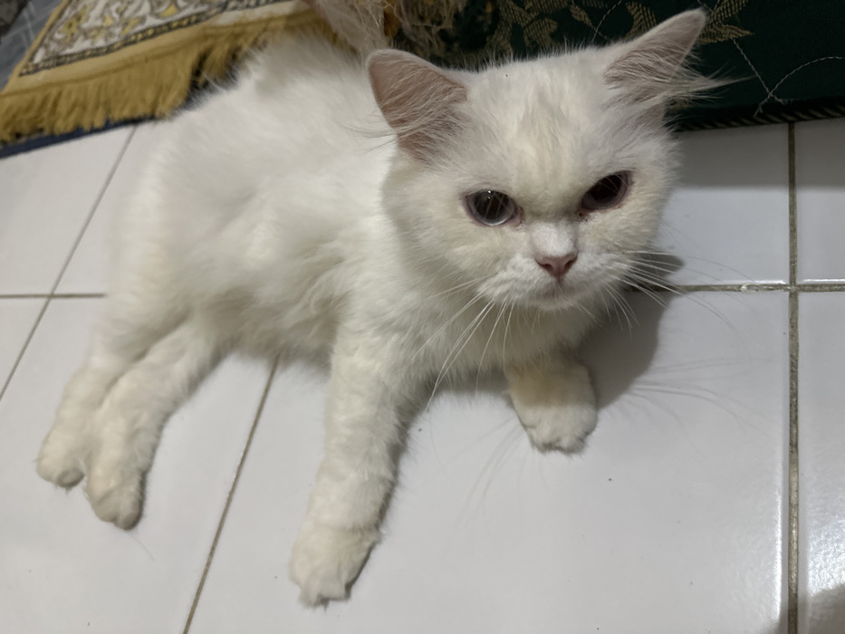 - "A white, long-haired domestic cat is observed lying supine on a tiled floor within a residence in Sidoarjo, Indonesia" by FM-gujip2, licensed under CC BY 4.0