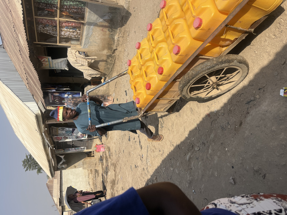 - "In Dzhidu, Nigeria, a man is observed pushing a two-wheeled cart laden with approximately 18 yellow plastic jerrycans, each sealed with a red cap, along an unpaved dirt path" by FM-marMB2, licensed under CC BY 4.0