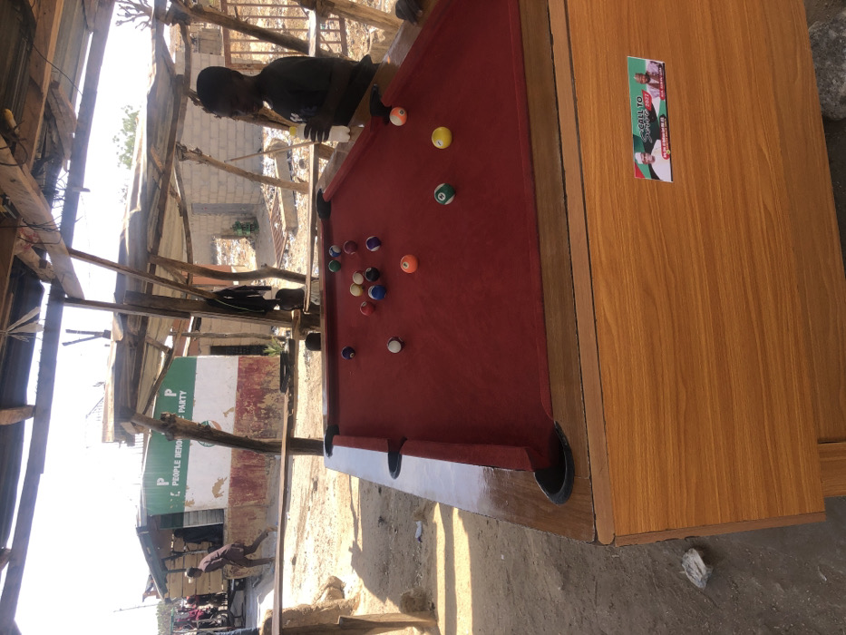 The image captures an outdoor scene in Wai A, Nigeria, under direct sunlight. In the foreground, a wooden-framed pool table with a red felt surface is positioned centrally, displaying multiple colored pool balls, including solids, stripes, an 8-ball, and a white cue ball. On the right side of the table, a young male individual, clad in a dark t-shirt, stands holding a white plastic bottle. The visible side of the pool table's wooden base features a rectangular sticker that reads "CALL TO SERVE 2023" and depicts two male political figures, identified as Atiku Abubakar and Ifeanyi Okowa. The ground surrounding the pool table is unpaved, consisting of packed dirt and scattered debris. Above the pool table, a makeshift shelter provides shade, constructed from rough wooden poles supporting a corrugated metal or similar material roof. In the mid-ground, a corrugated metal building is visible, painted green and white, with the inscription "P PEOPLE DEMOCRA PARTY" partially legible, indicating an affiliation with the People's Democratic Party. To the left of this building, another male figure, dressed in a brown garment, is observed walking away from the camera. The background features additional simple structures, some appearing partially constructed or dilapidated, beneath a clear sky.