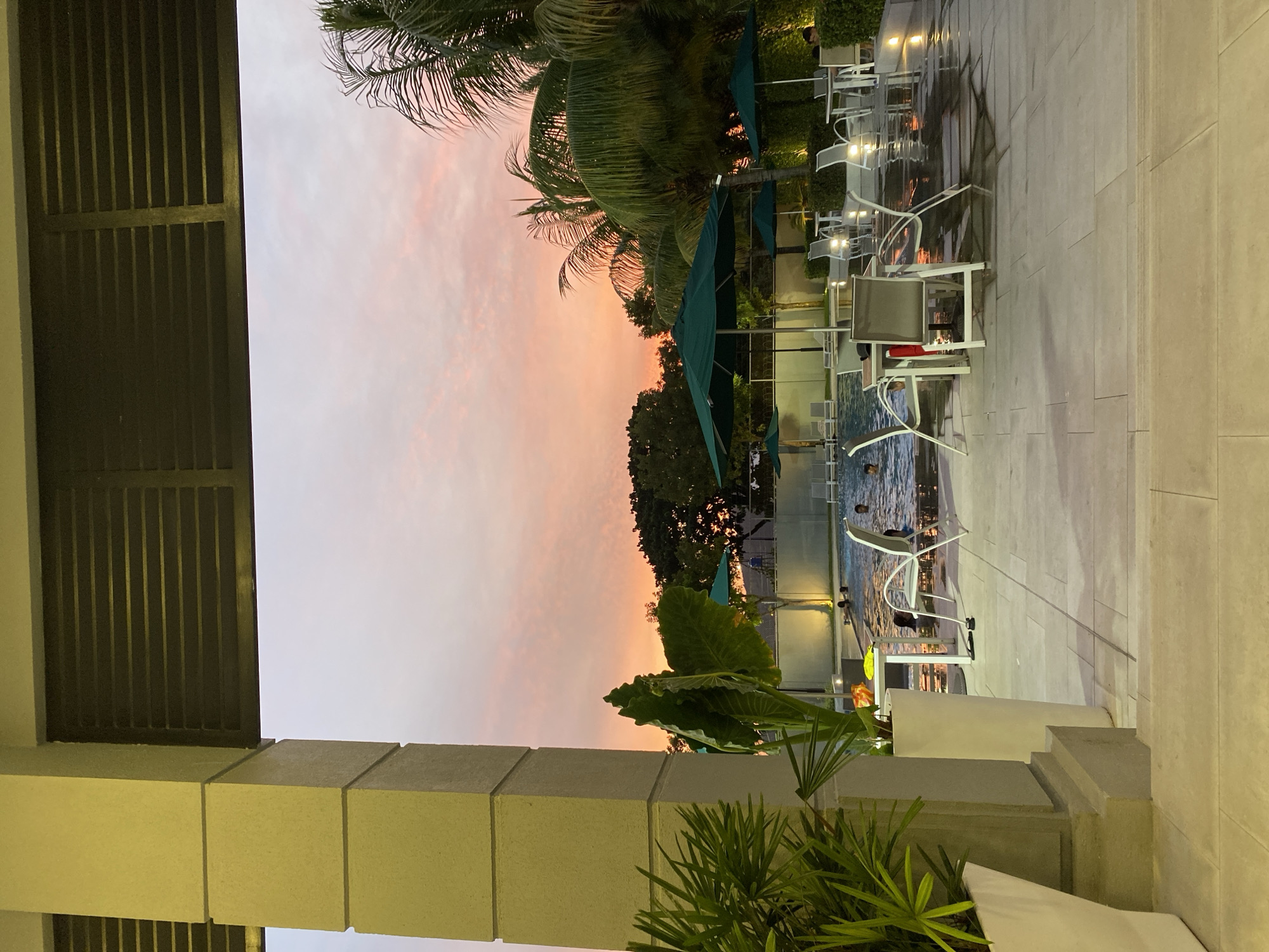 The image portrays an outdoor swimming pool and patio area at dusk in La Aurora, Ecuador. The sky displays distinct pink, orange, and light blue hues characteristic of a sunset, with a low cloud cover. In the immediate foreground on the left, a large, light-colored architectural column stands vertically. To its left, a white planter contains green, palm-like foliage. Between the column and the pool, another tall white planter holds a large-leafed green plant. The central feature is a rectangular swimming pool, actively occupied by approximately six to eight individuals who are partially submerged, appearing to be swimming or wading. The water surface reflects the ambient sky and artificial lighting. Surrounding the pool is a light-colored tiled patio, which exhibits wet patches from splashing or recent moisture. Arranged on the patio are multiple dark green patio umbrellas, alongside numerous tables and chairs with light-colored frames. One table in the foreground has a yellow object and an orange object placed on its surface. A red garment is draped over a chair near another table. At the far end of the pool, several lounge chairs are visible. The background features dense green vegetation, including numerous prominent palm trees on the right side, and a line of other trees against the horizon. A low wall or fence, partially illuminated by artificial lights, separates the pool area from the distant vegetation. Artificial lighting sources are active around the pool deck and the wall, providing illumination as natural light diminishes.