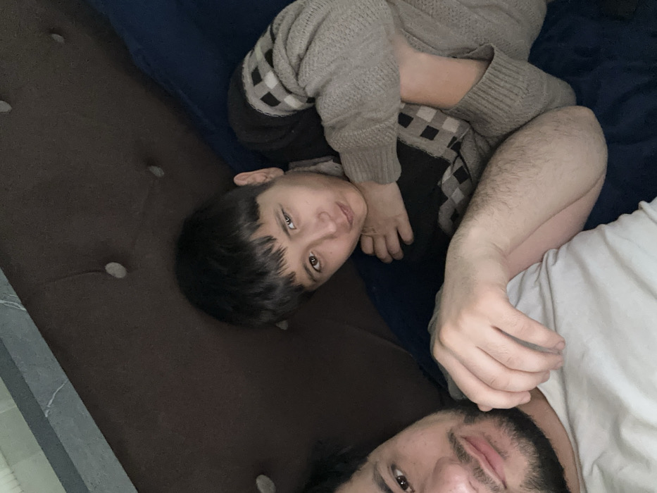 An indoor scene in Rishtan, Uzbekistan, depicts two individuals lying down, posing for a close-up photograph. In the foreground on the left, an adult male with dark hair and a short beard is visible from the chest up, wearing a white t-shirt. He looks towards the camera with a subtle smile. To his right, a child or young adolescent with dark hair and bangs is positioned, wearing a patterned sweater featuring grey and black squares. This individual is turned slightly towards the camera, looking directly at it with a pouting or quirky expression, with their arms bent and held close to their body. The background features a dark brown, tufted headboard or backrest and a dark blue blanket or sheet. The lighting is dim.