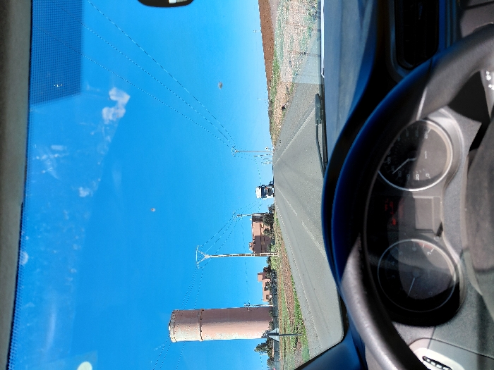 The scene is observed from inside a vehicle, looking forward through a windshield. The dashboard and a dark gray steering wheel, featuring an instrument cluster with two primary gauges, occupy the lower half of the image. The vehicle is positioned on a paved asphalt road in Bni Yakhlef, Morocco, which extends into the distance and ascends an incline. On the left side of the road, a tall, cylindrical, light brown water tower stands prominently. Behind it, several low-rise, reddish-brown buildings are visible amidst sparse green and reddish-brown vegetation. Utility poles carrying power lines run parallel to the road on both sides, with the lines distinctly visible against the sky. Further along the road, a white semi-truck with a blue cab is seen ascending the distant incline. The sky is clear and bright blue, showing minimal cloud cover and some dust or smudges on the windshield. The environment appears to be semi-arid, characterized by dry, cultivated, or fallow fields flanking the roadway. No individuals are visible.