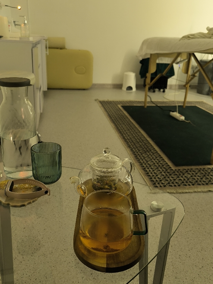 A glass table displays a tea set with a full mug of tea on a wooden tray, and a tea kettle containing tea. Next to it is a green drinking glass and a bottle of water. In the background, there is a yellow massage table, a white step stool, and a green rug.