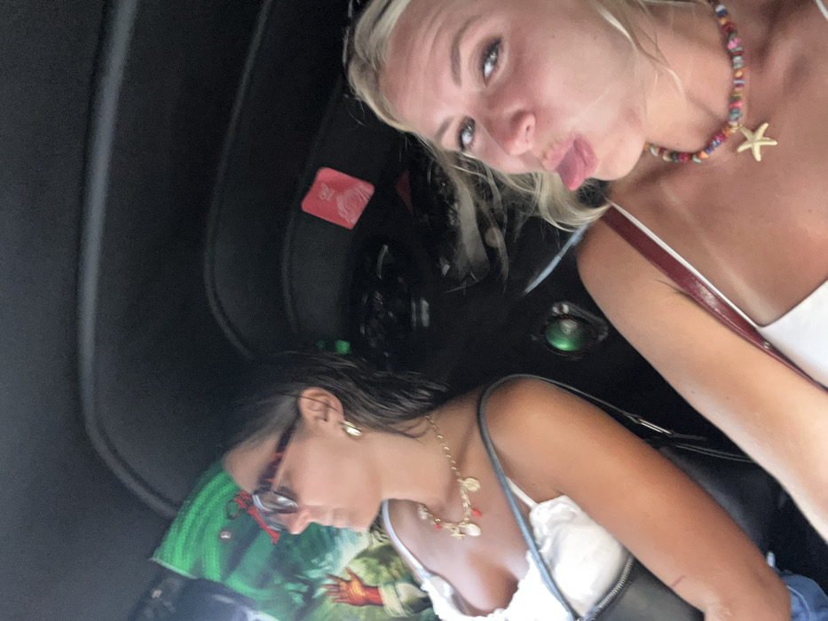 Two females are depicted inside a tuk-tuk, likely in Mirissa, Sri Lanka. The subject on the left, positioned slightly further back, has dark, damp hair and wears tortoiseshell-patterned sunglasses. She is looking towards the left of the frame, wearing a white strappy top and a gold-colored necklace with small red and white charms. A black shoulder bag strap is visible. The subject on the right is closer to the camera, with blonde, damp-looking hair, looking directly at the viewer with her tongue extended in a playful manner. She wears a white strappy top with a maroon strap over her right shoulder and a colorful beaded necklace featuring a large golden starfish charm. The interior of the vehicle is dark, with a black overhead canopy. A green and red graphic design, possibly a decorative fabric or a bag, is visible behind the left subject, along with a small red sticker on the interior panel.