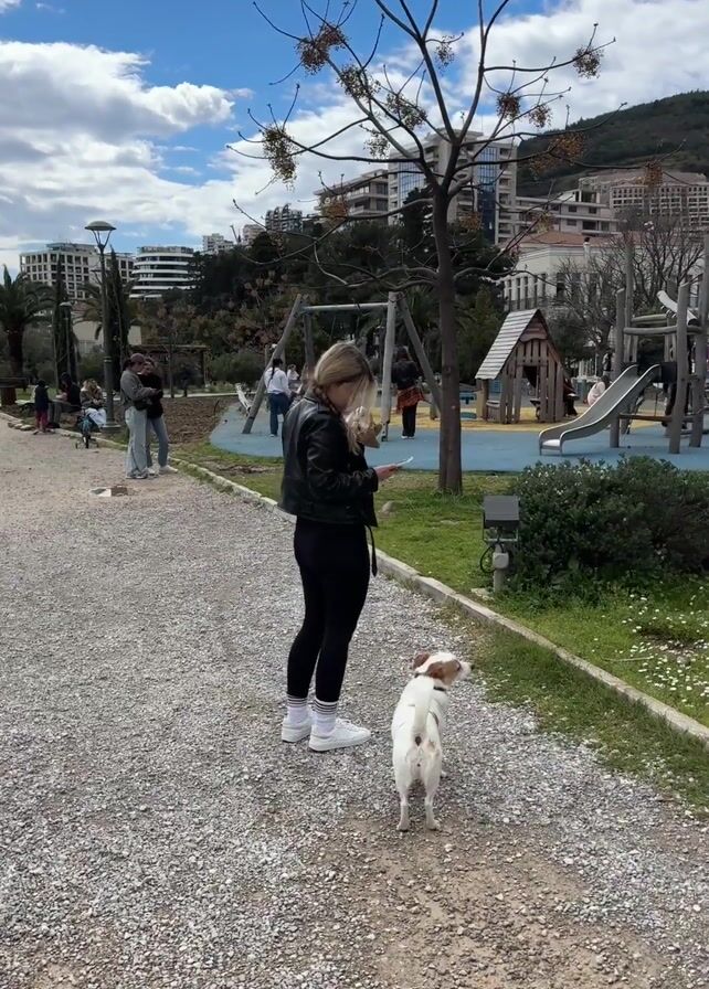 A young woman walks her white and brown dog on a gravel path in a park. The woman wears black leggings, a white t-shirt, a black leather jacket, and white sneakers. She has blonde hair pulled back into a low ponytail. She briefly looks at her phone and then takes a bite of food from a white container. The dog is on a leash and looks up at the woman expectantly. In the background, there is a playground with swings, a slide, and a small wooden playhouse. Other people are visible in the park, including adults and children. The sky is blue with some clouds, and there are buildings and a hill in the distance. A bare tree with small buds stands near the path.