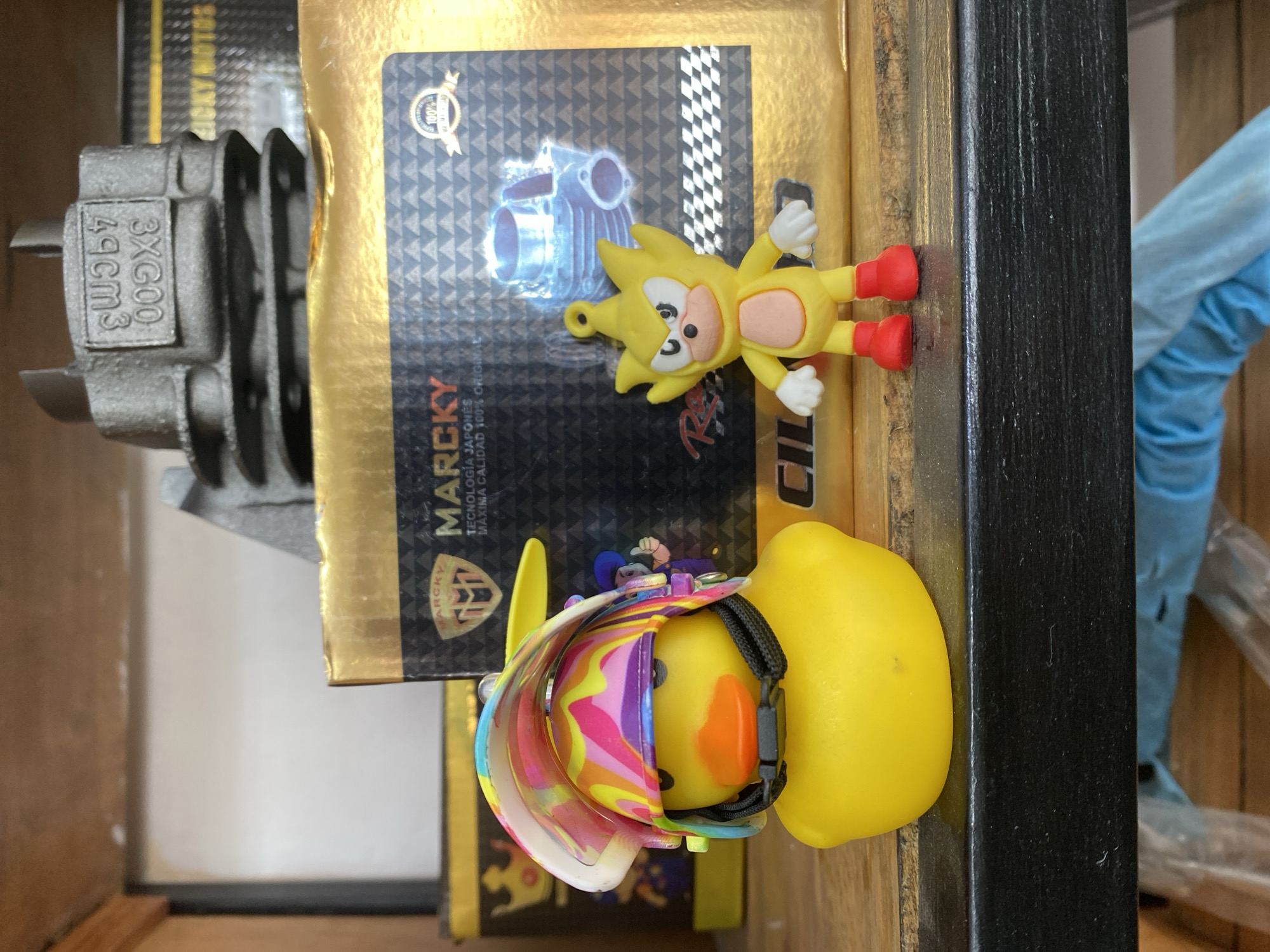 The image depicts a close-up view of several objects. A gray cast iron cylinder head with "3XG00 49cm3" inscribed on its side lies next to a gold box labeled "MARCKY TECNOLOGIA JAPONES." On top of the box, there's a yellow Sonic the Hedgehog figurine and a yellow rubber duck wearing rainbow-colored goggles. A blurred blue garment is visible in the background. The image likely captured a tabletop or shelf setup, though the context of Tinaquillo, Venezuela, is not evident from the visual data provided.