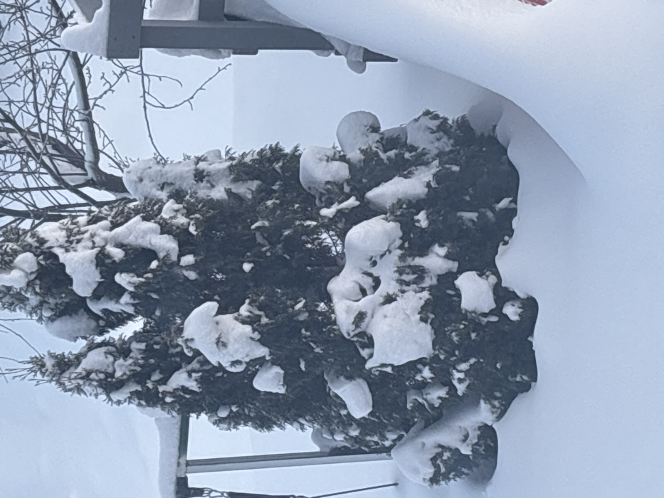 A winter scene showcases a dark green bush heavily laden with patches of white snow