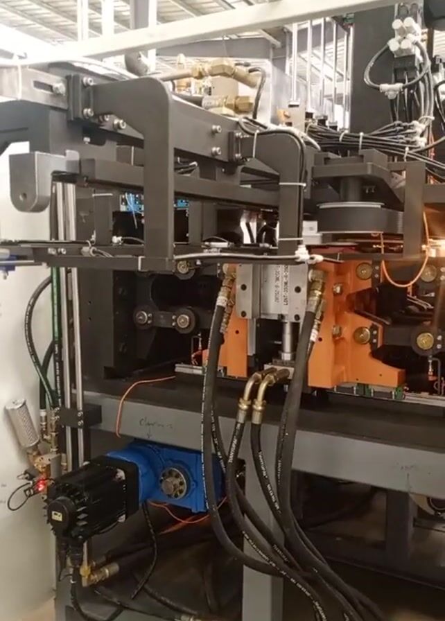 complex industrial machine in operation. A large metal frame supports various mechanical and pneumatic components. A robotic arm-like structure moves horizontally, seemingly transferring objects or performing a manufacturing process. Several hoses and electrical cables connect to the machine, providing power and control. The machine’s movement appears automated and repetitive. The scene suggests a production line within a factory setting.