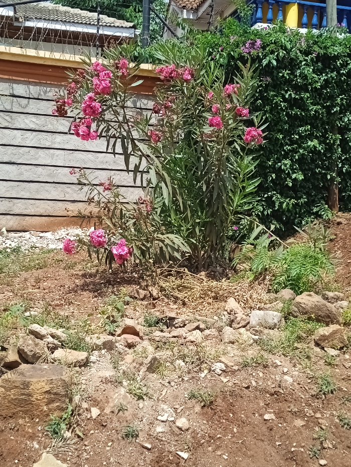 This image depicts an outdoor, ground-level scene in Embu, Kenya, under bright daylight. The foreground consists of dry, reddish-brown earth intermingled with scattered small rocks, concrete fragments, and sparse patches of green and desiccated weeds. Dominating the midground is a large shrub, identified as Nerium oleander, characterized by numerous clusters of vibrant pink flowers and elongated dark green leaves. To the immediate right of the shrub, a section of dried, light brown plant debris is visible, bordered by a patch of smaller, bright green leafy plants. The background displays structural elements. On the left, a wall constructed of horizontal panels, painted light brown at the top and grey below, is capped with a security fence featuring multiple strands of barbed wire. Behind this fence, the terracotta-tiled roof of a building is partially visible. Towards the right background, a dense, dark green hedge forms a vertical boundary. Above this hedge, a building with a blue balustrade or railing and yellow architectural details is discernible. No individuals, actions, or interactions are present within the frame.