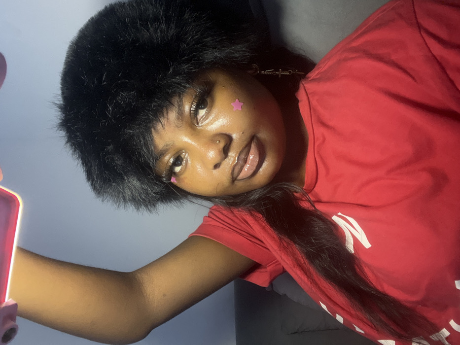 The scene is located indoors in Badore, Nigeria. A female individual with dark skin and long, straight dark hair is depicted from the chest up, facing the camera. She wears a voluminous black faux fur hat and a red short-sleeved t-shirt with white markings on the left shoulder/chest area. Her left arm is raised, holding a mobile phone above her head, with the phone's screen or flash illuminating her face. Her facial features include prominent eyelashes, glossy lips, and a small stud piercing in her right nostril. Two pink, five-pointed star-shaped adhesive stickers are applied to her face: one beneath her left eye and another on her right cheek. A multi-component earring, featuring chain links and cross-shaped pendants, is visible on her left ear. The background consists primarily of a light blue-grey wall. A segment of a dark grey upholstered furniture piece, consistent with a couch, is visible behind her left shoulder.