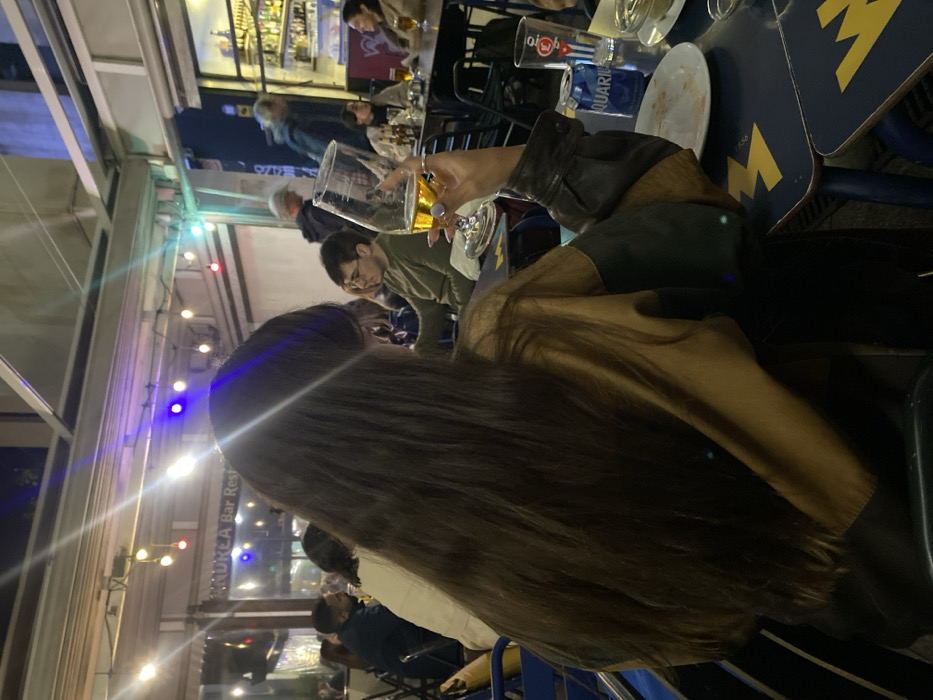 The image displays an evening scene on the covered outdoor terrace of Andrea Bar Restaurante, situated at Carrer de Llull, 169-171, Barcelona, Spain. The foreground is dominated by a person with long, dark brown hair, viewed from behind, wearing a two-tone jacket primarily brown with dark accents. This individual holds a stemmed glass containing a residual amount of amber liquid, likely beer, in their right hand; their fingernails are painted a light purple hue. On the dark blue table immediately in front of the person, a white plate with food residue, a blue "Aquarius" brand soda can, and a clear glass with a red logo are present. Overhead, strings of multi-colored lights (red, blue, yellow, green) illuminate the area, causing prominent lens flares. In the mid-ground, a male wearing glasses and a green sweater is seated to the right, facing left. The background reveals a brightly lit interior bar area with shelving stocked with bottles, and several other patrons are seated at various tables. Two additional individuals are standing near the bar. The environment indicates a casual, social gathering at a restaurant/bar during nighttime.