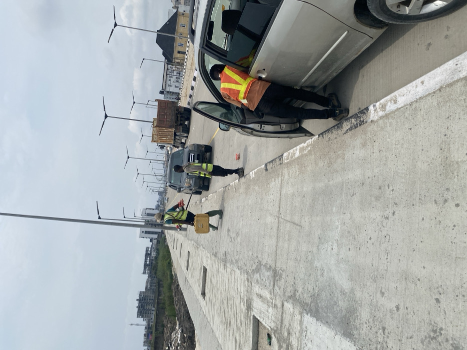 The image depicts an outdoor urban environment, specifically a wide, multi-lane road and an adjacent concrete walkway in Alaguntan, Nigeria, under an overcast sky. The concrete roadway features white lane markings and is flanked by numerous tall poles with dark, flat-panel streetlights. A wide, light-grey concrete pedestrian walkway runs along the left side of the road, containing several evenly spaced rectangular cutouts. Three adult males are visible. One individual, wearing a green shirt, green boots, and a yellow reflective safety vest, walks from right to left on the concrete walkway, carrying a yellow rectangular case in his left hand and a long pole with an attached implement in his right hand. A second individual, wearing a green shirt, dark trousers, and a yellow reflective vest, stands on the edge of the concrete walkway, near the road. A third individual, wearing an orange shirt, dark trousers, and an orange reflective safety vest, is positioned with his back partially to the camera, leaning into the open front passenger door of a silver minivan parked partially on the road's shoulder on the right side of the frame. Vehicles present on the road include a dark-colored SUV parked behind the silver minivan and a brown dump truck traveling in the far lane further down the road. The background on the left reveals an area of undeveloped land with debris, followed by distant multi-story buildings, some appearing to be under construction. On the right side of the road, a cluster of residential-style buildings with dark roofs is visible in the distance.