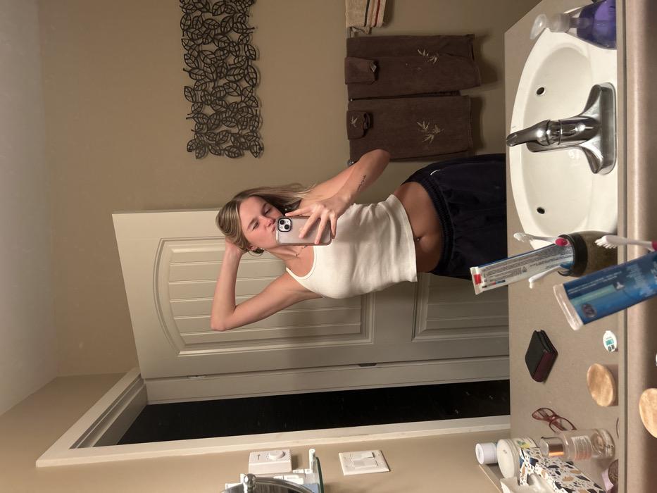 A young woman with blonde hair poses in a bathroom mirror. She is wearing a white tank top and dark blue shorts. The bathroom features a white sink with a silver faucet, a door, and neutral-toned walls. Decorative metal leaves hang on the wall. Various toiletries clutter the counter space. She is holding a smartphone and making a kissy face for the selfie.