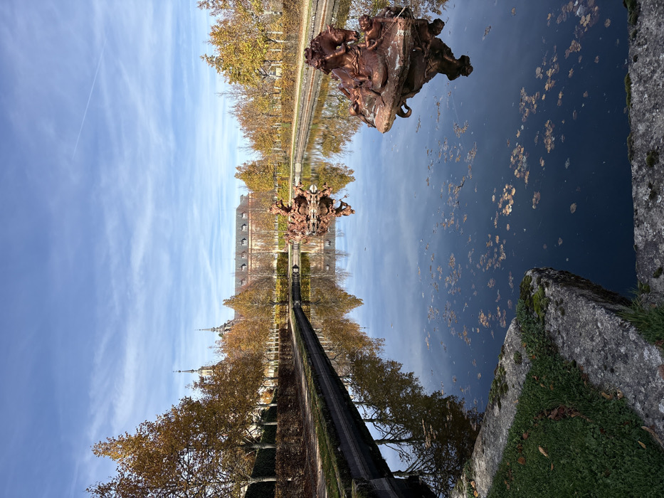 This image depicts a section of the formal gardens at the Royal Palace of La Granja de San Ildefonso, located in San Ildefonso, Spain, under a clear blue sky with sparse cirrus clouds. The central feature is a long, rectangular reflecting pond, its dark water covered with scattered brown and yellow autumnal leaves. Two prominent, multi-figure bronze-toned sculptures emerge from the water. The sculpture in the foreground, positioned to the right, depicts a dynamic scene possibly involving a rider on a rearing horse amidst smaller figures or marine elements. A second, similar sculpture is visible further back in the pond. Both sculptures are reflected on the water's surface. The pond is bordered by low, moss-covered stone walls. Along the left bank, a strip of green grass leads to a paved pathway, beyond which stands a continuous line of deciduous trees with vibrant golden-orange autumn foliage. Further back, a neatly trimmed dark hedge runs parallel to the tree line. The right bank mirrors this arrangement of stone and autumnal trees. In the background, a grand, multi-story architectural structure, consistent with the Royal Palace itself, is visible. It features a light-colored facade, numerous windows, a red-tiled roof with dormers, and multiple dark spires. The entire scene is brightly illuminated, casting clear reflections on the water. No individuals are present.