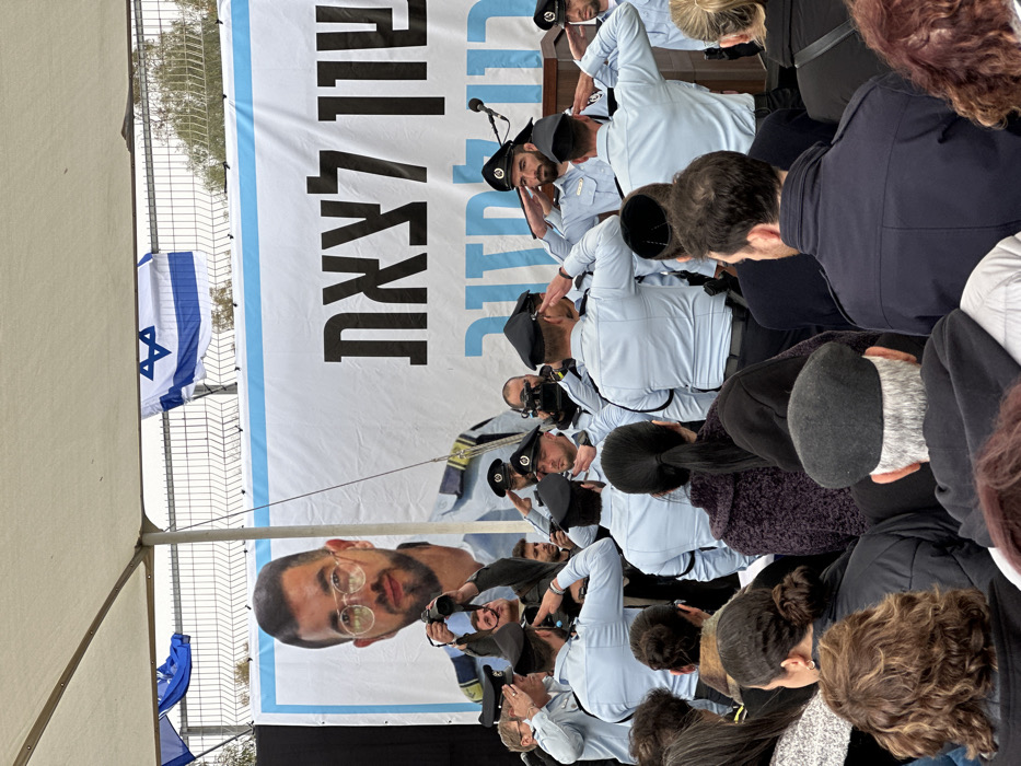 The image depicts a formal ceremony taking place outdoors under a white canopy in the city of Meitar, Israel. A large white banner, featuring a prominent portrait of a bearded man wearing glasses and a uniform, serves as the primary backdrop. Hebrew text on the banner reads "שון לצאת" and partially "בן לזכור," indicating a memorial or tribute. Behind the banner, a chain-link fence is visible, topped with an Israeli flag flying on a pole to the right, and another blue flag partially visible to the left. In the middle ground, a group of approximately twelve male individuals, uniformed in light blue short-sleeved shirts, dark trousers, and dark peaked caps, are standing in formation. Most of these individuals are performing a military-style salute, with their right hands raised to their caps. They are primarily viewed from the rear or side, facing towards a wooden podium with a microphone, visible on the right. One individual within this group is visible holding a camera, directed towards the saluting officers. In the foreground, a diverse assembly of civilians is gathered, observed from behind, facing the uniformed individuals and the banner. The audience consists of individuals with varied hair colors and styles, dressed in dark, casual clothing. Visible details include a person with gray hair wearing a dark flat cap and another wearing a kippah. The overall scene conveys a solemn and organized public gathering.