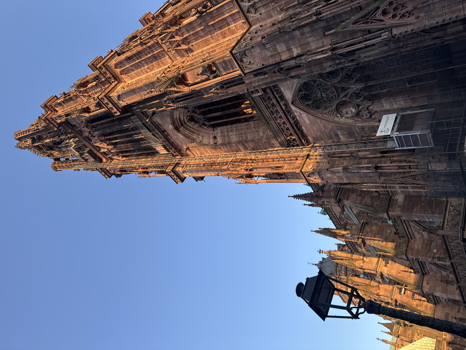 The image displays a low-angle view of the Cathédrale Notre-Dame de Strasbourg, located in Strasbourg, France
