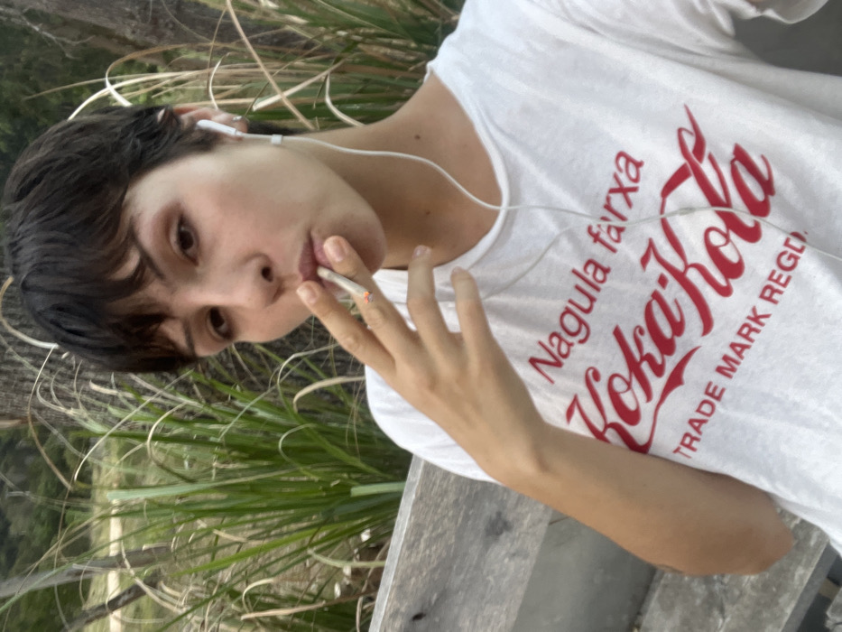 A person wearing a white T-shirt with a red "Koka Kola" logo is holding a lit cigarette in their mouth. The person has short, dark hair and is wearing wired earphones. They are situated outdoors, with grass visible in the background and a wooden surface in the foreground. The image is slightly rotated.
