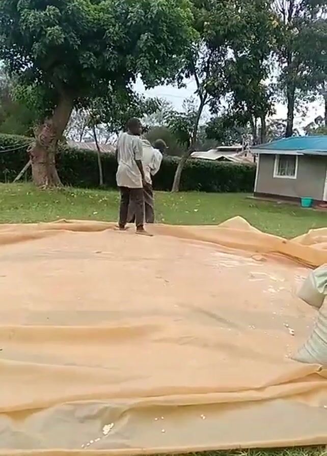 two men on a grassy lawn near a small house. One man carries a large sack on his back towards the house. There are already three similar sacks on a large tan-colored tarp that is spread out on the grass. The men appear to be transporting the sacks to or from the tarp. The background includes a line of trees and a gray house with a blue roof.