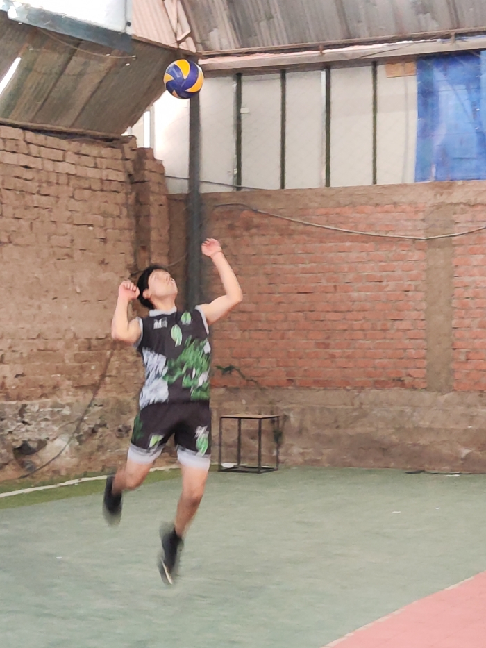 A young man leaps upward to strike a volleyball. He wears a green and black athletic outfit with a sleeveless shirt. The volleyball is slightly above him, positioned centrally. The background features exposed brick walls, a tin roof, and a green and red floor. A small metal table stands near the back wall. The image is well-lit, highlighting the subject in motion.