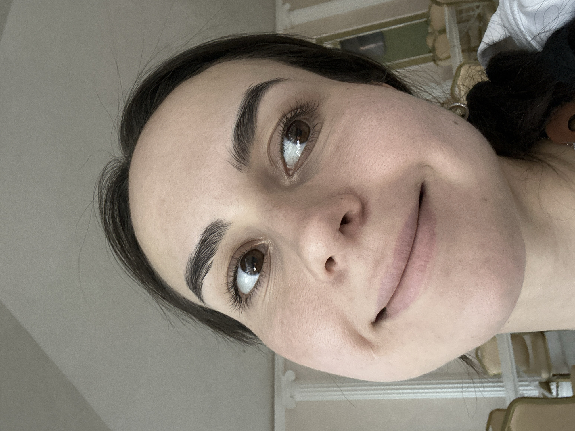 The image is a close-up self-portrait of a woman with fair skin, dark hair, and brown eyes. She is looking upwards with a slight smile. Her eyebrows are well-defined and dark. The background is blurry and indistinct, showing a light-colored wall and possibly a glimpse of furniture. Based on the location data, the photo was taken in посёлок опытного хозяйства «Ермолино», Russia.