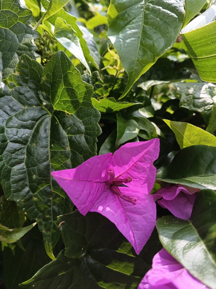 A vibrant fuchsia bougainvillea flower dominates the frame, its papery bracts sharply triangular. Lush green foliage surrounds the flower, creating a dense background. Leaves vary in shape and texture, from deeply veined ivy-like leaves to smooth, glossy ones. Sunlight filters through the leaves, highlighting their texture and adding depth to the scene. A glimpse of additional bougainvillea flowers suggests a vibrant, blooming plant.